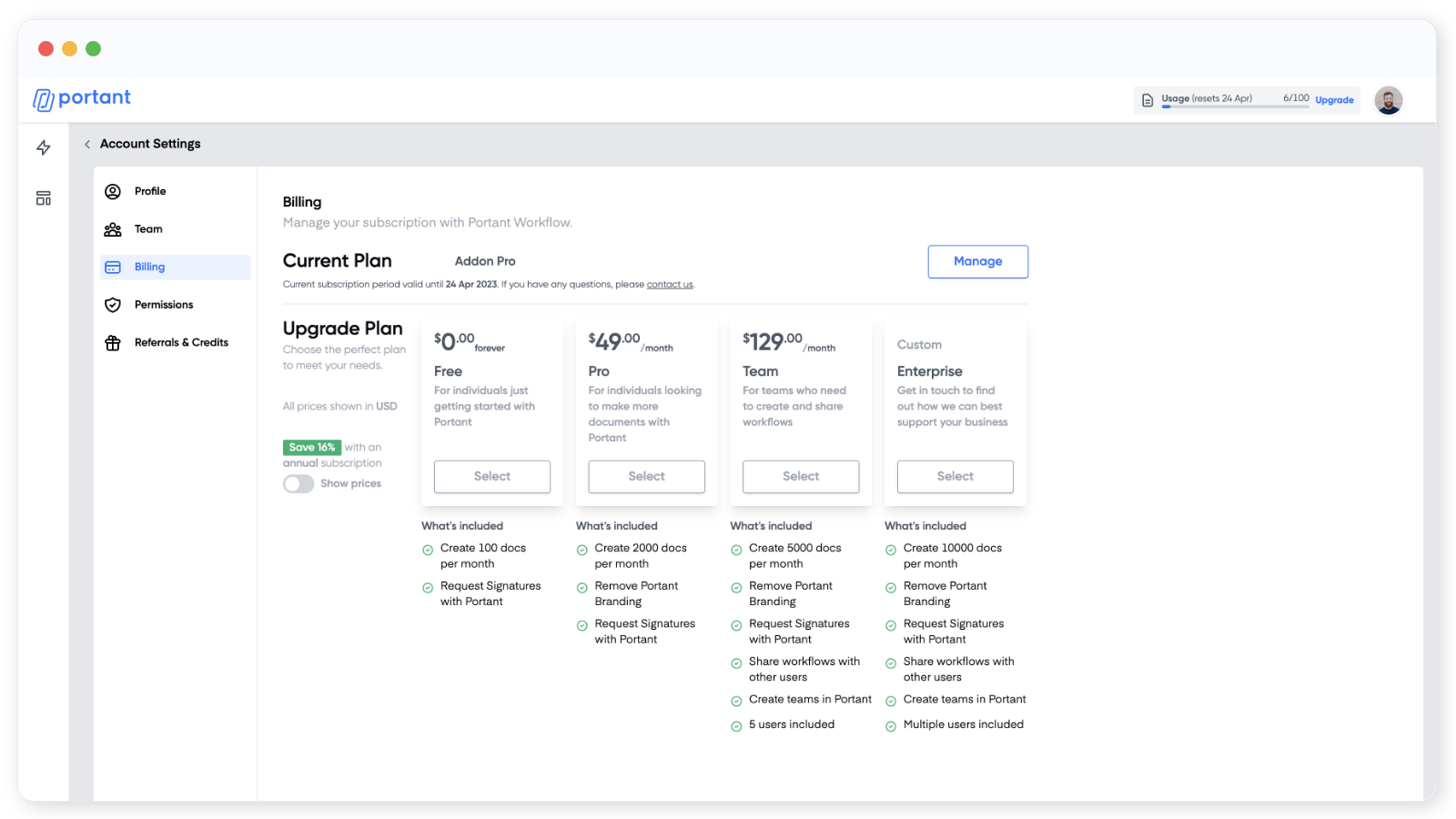 Your billing settings options are located on the billing page here: https://app.portant.co/settings/billing