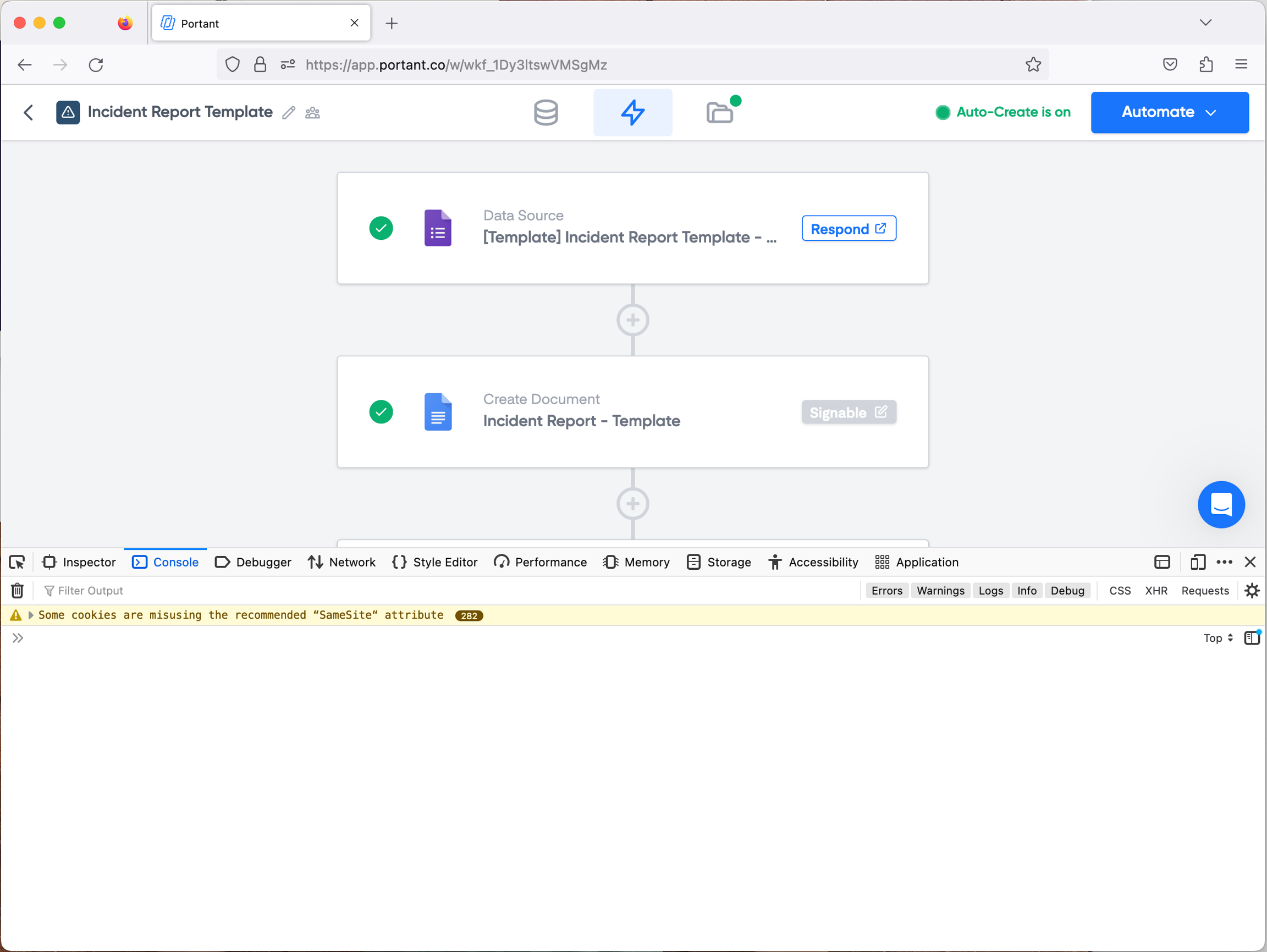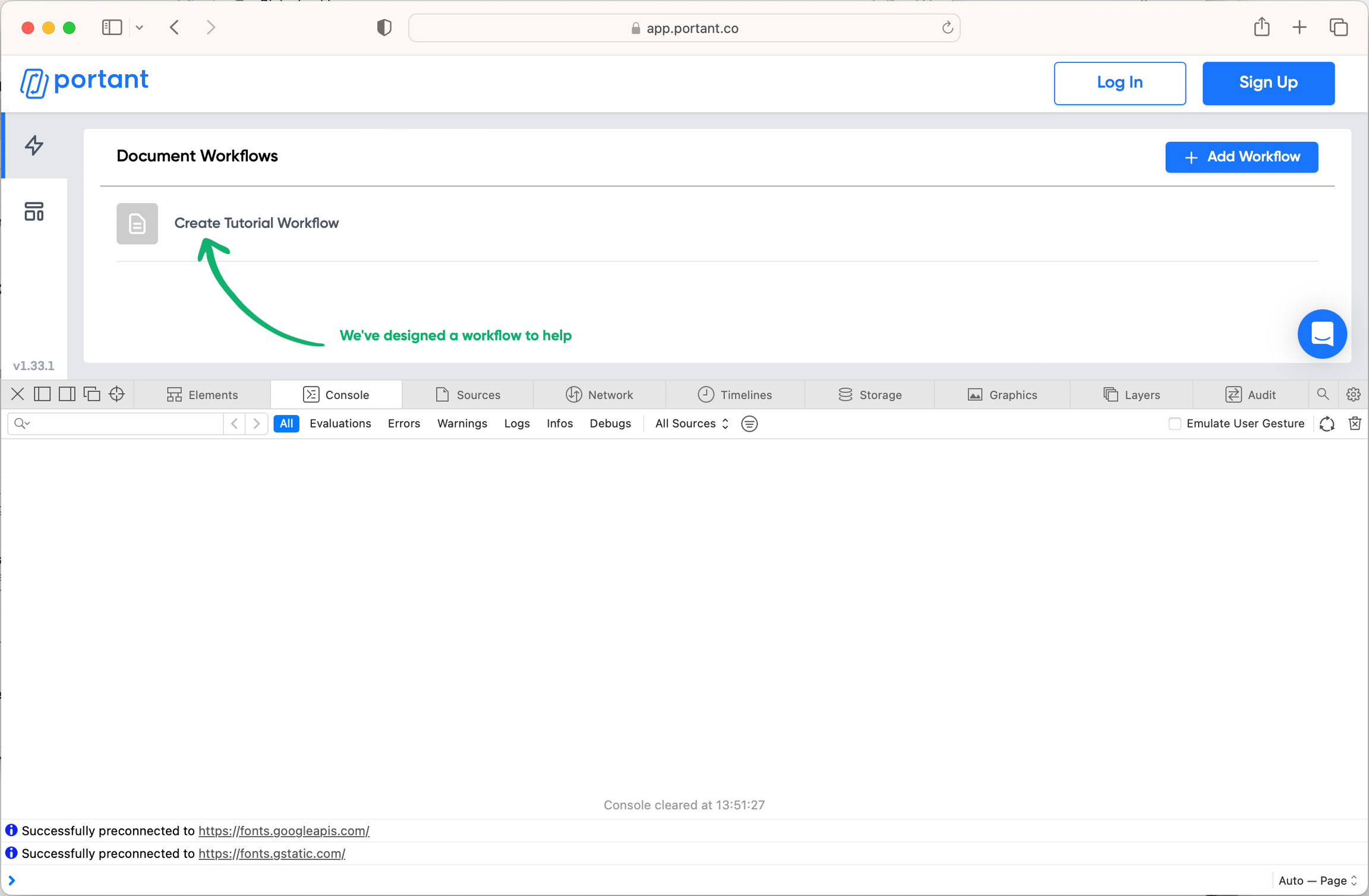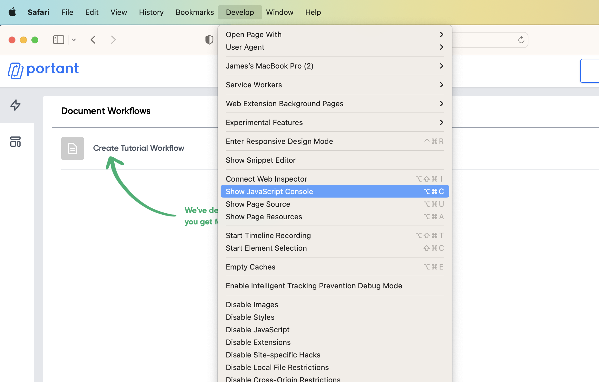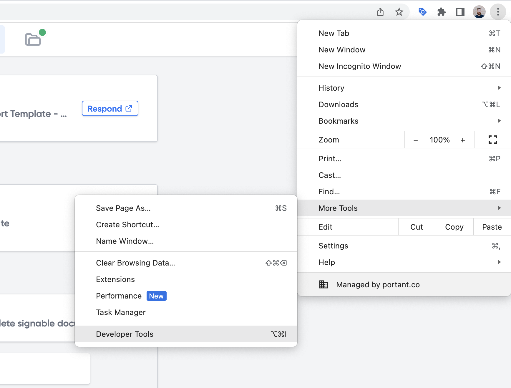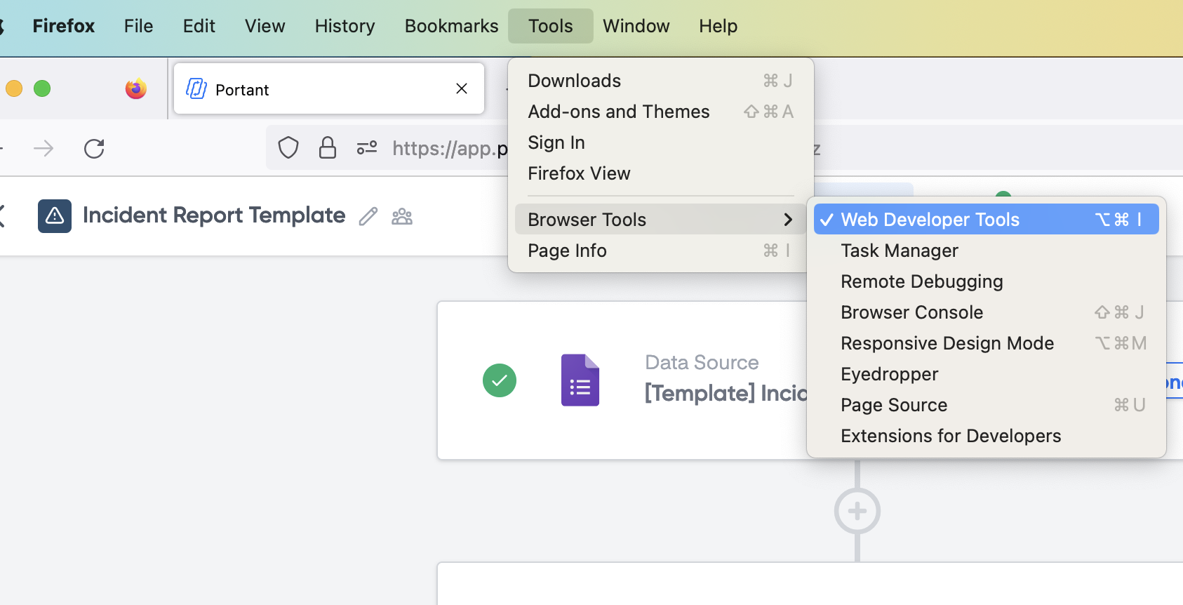 The information displayed in the developer console can be extremely helpful for the Portant support team when we're trying to figure out how to solve an issue. In the course of troubleshooting your issue, the Portant support team may ask you to take a screenshot of the developer console.