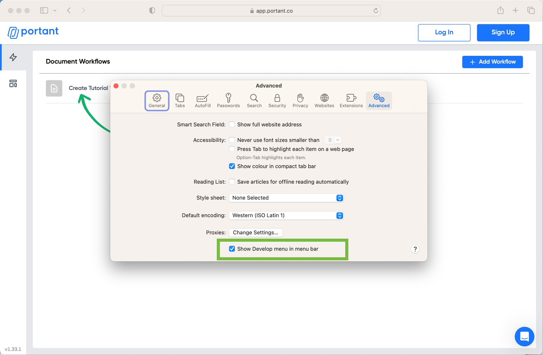 Once in the Settings dialog, navigate to the Advanced tab, then check the "Show Develop menu in the menu bar" box.