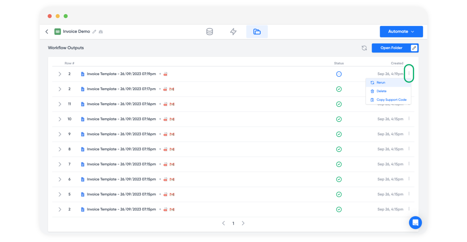 Next, you'll see a list of all the items in your workflow. To spot items with errors, keep an eye out for the status icon β it will be marked in yellow if the automation item has errors. Then, when you find the Automation item you need the support code for, On the right-hand side, you'll notice an icon featuring three dots. Give it a click, and then select "Copy Support Code":