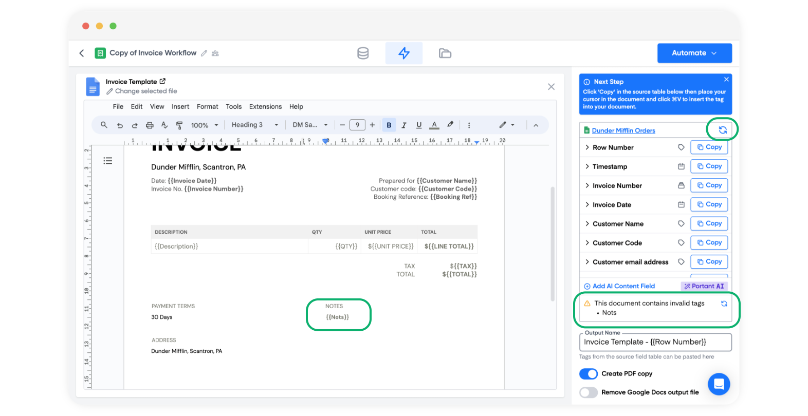 In this example, there is a typo in the tag {{Notes}}, which will result in Portant being unable to place the source data in the output document. To resolve this issue, correct the typo and then refresh your source table once more to ensure that all tags are valid and functioning correctly.