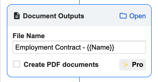 Before you start creating documents, you can edit your output documents’ name. If you are using Multiple documents mode, you can add {{tags}}, so each output document can have a different name. You can either copy and paste these tags from the document or place your cursor inside the file name field and press the 'Insert' button in the data source table.