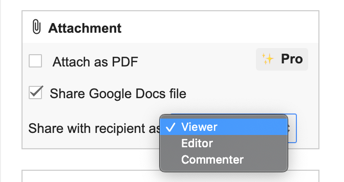 You can customise the attachments sent with your email. When you Share a Google Docs/Slides file you have three levels of access you can give the recipients: