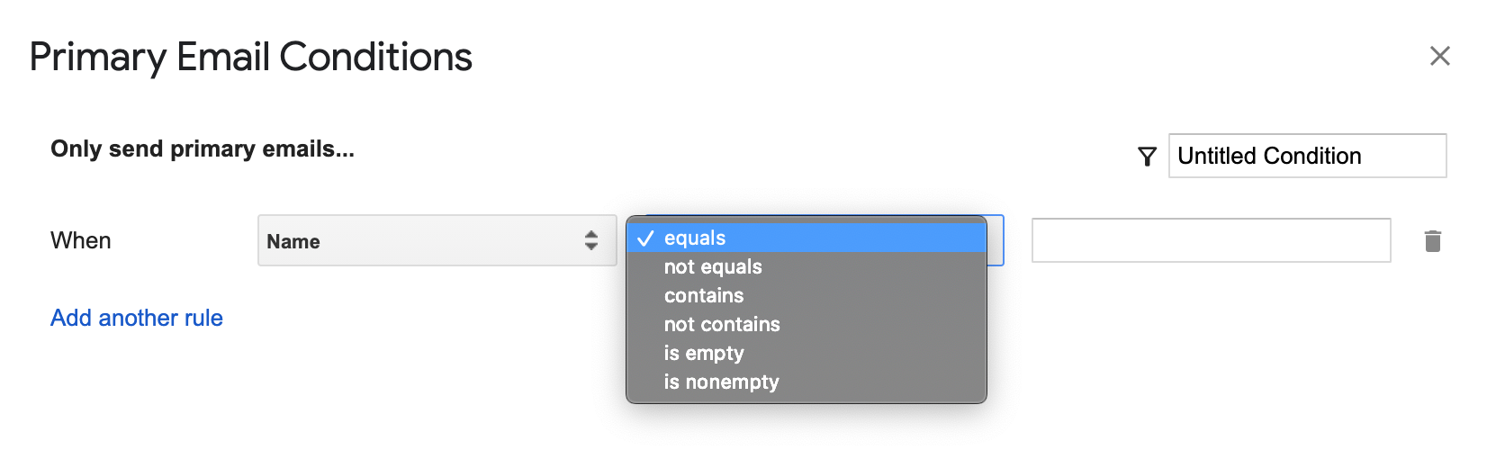Below the attachments box there is an option to set-up sending conditions. This is where you can send an email based on the data contained within a field in the data source. To switch this setting on, click the 'Send emails based on defined rules' checkbox. After you do this a new modal will open like this: