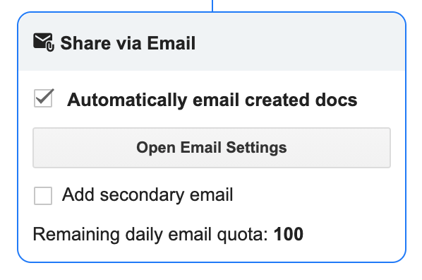 To add an email to your workflow, you need to tick the checkbox 'Automatically email created docs', which is located in the 'Share via email' box under 'Document outputs'. When you click this checkbox a modal will open with email settings.