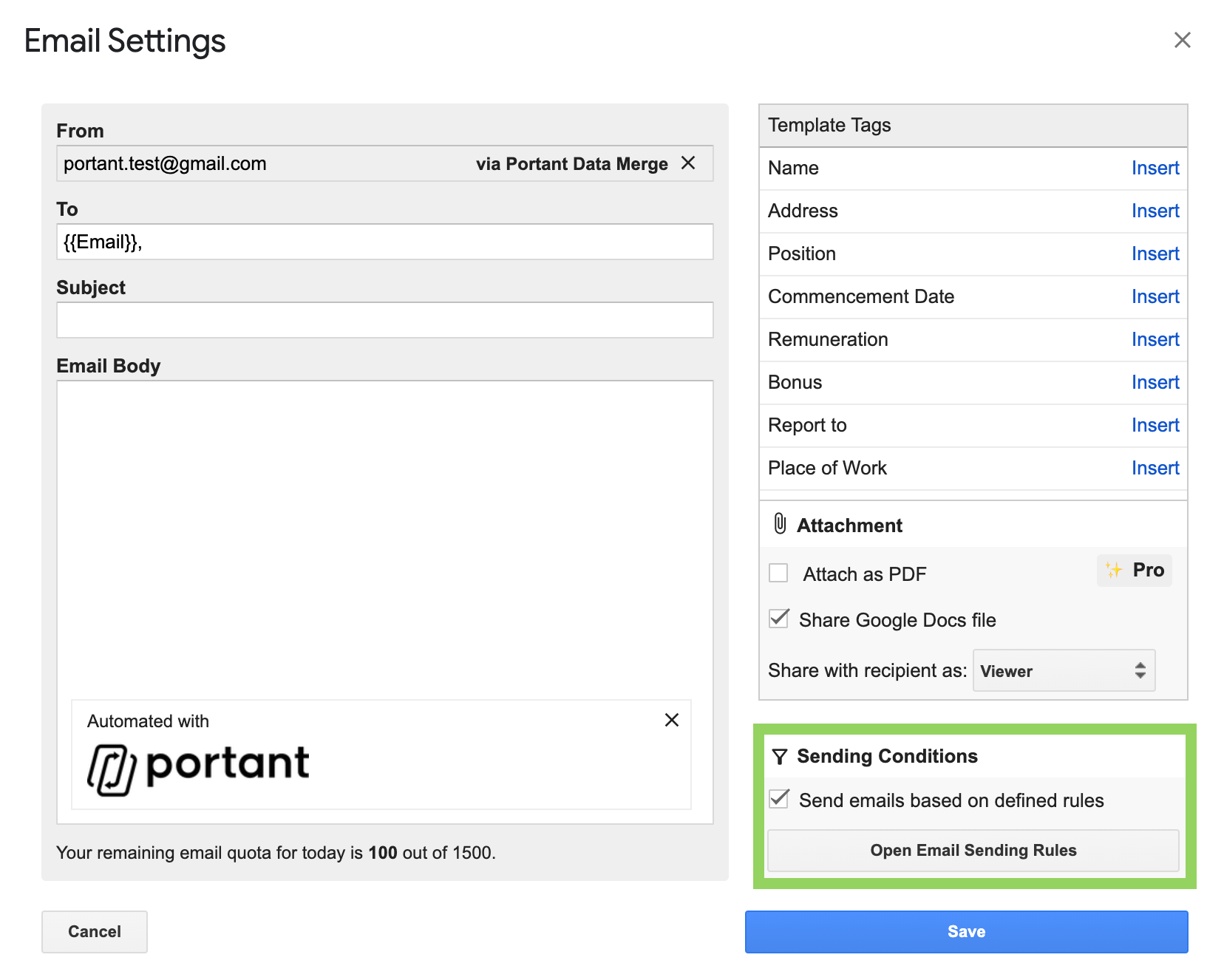 To add a condition to an email first you need to open up the Email settings by clicking the 'Automatically email created docs' checkbox within the 'Share via email' box. After the 'Email Settings' modal opens you can see the 'Sending conditions' on the right side under 'Attachments'.