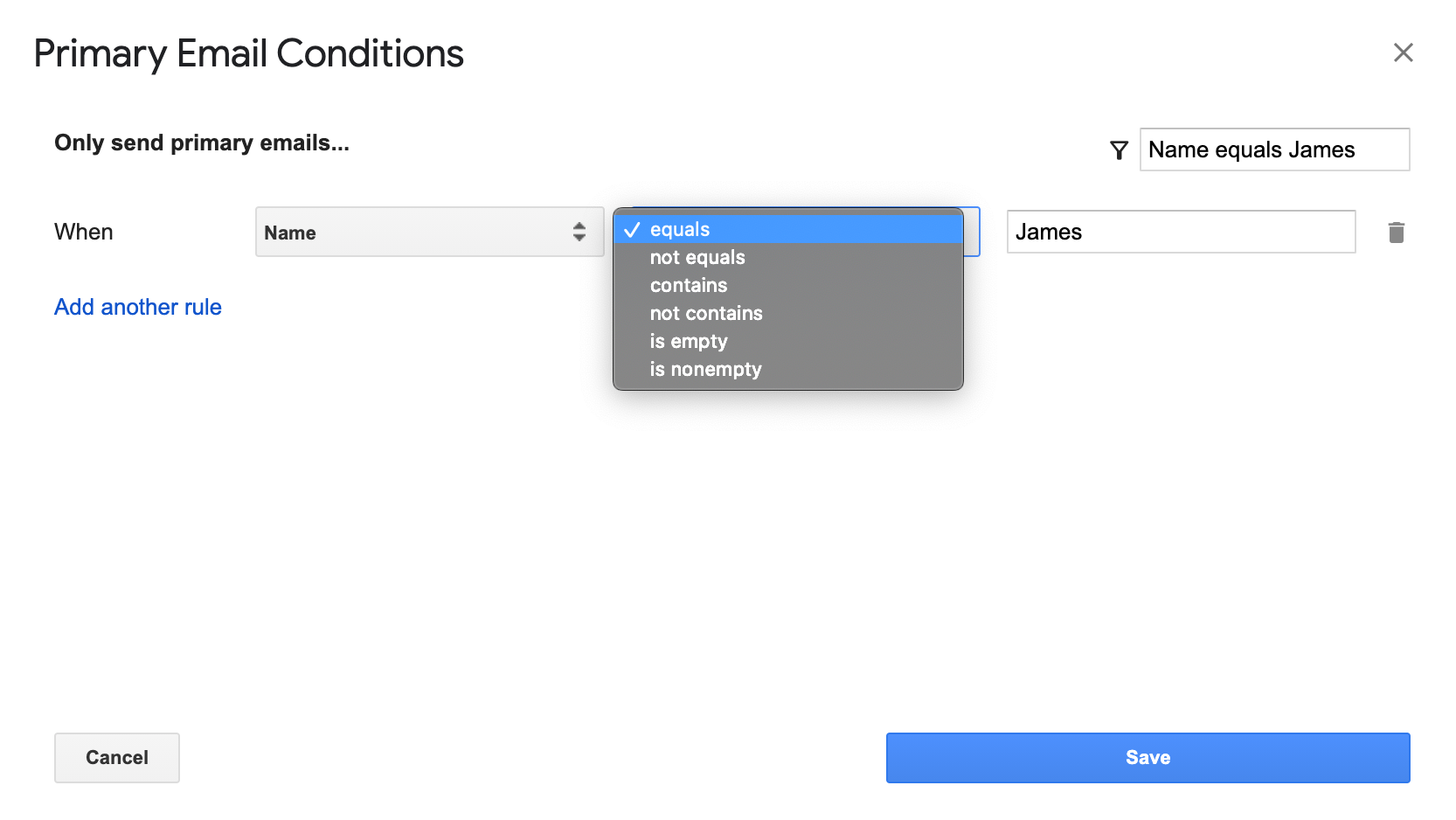 To set a condition select a field the condition will be based on in the first dropdown menu then select an operator between: