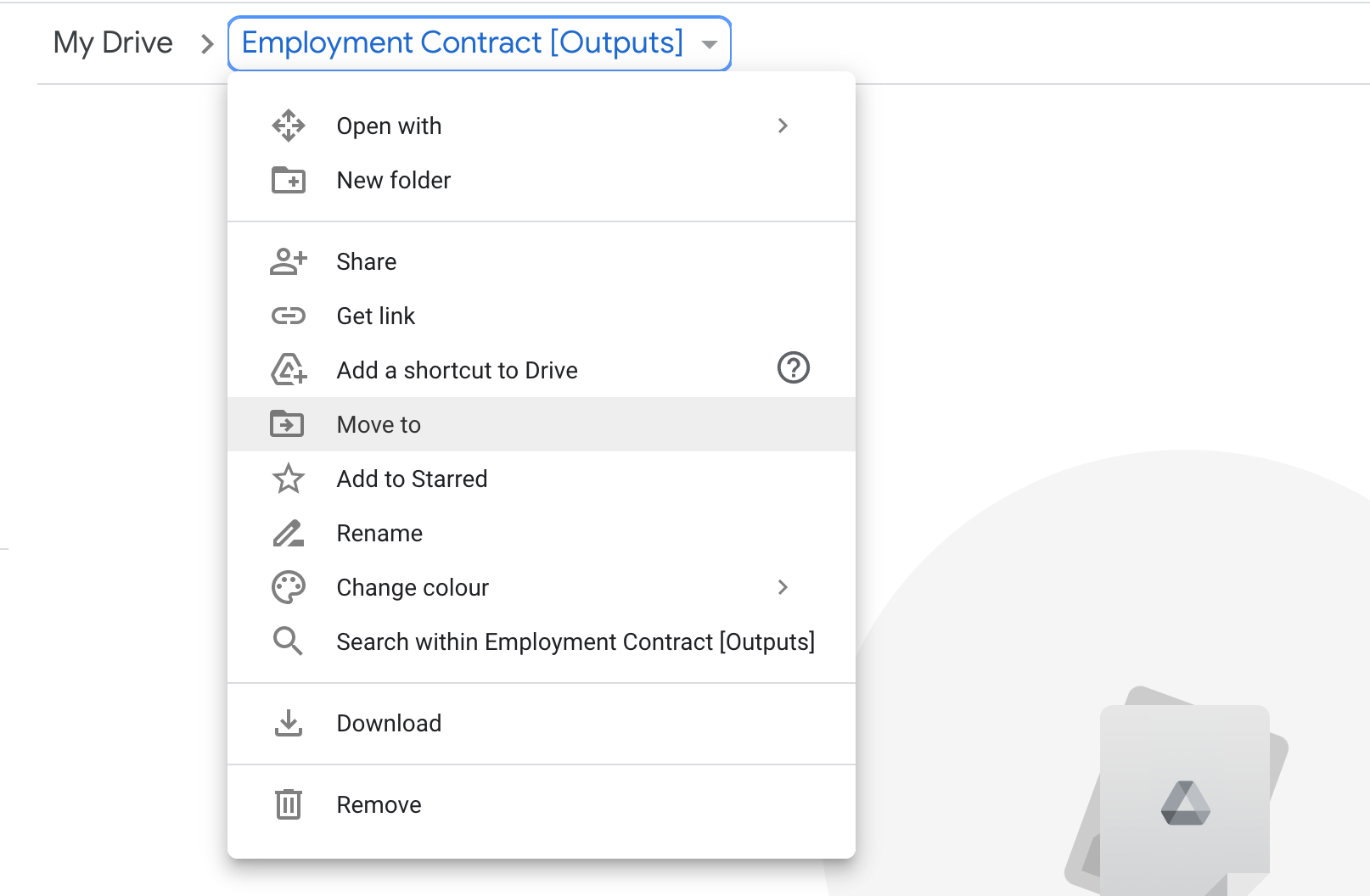 The folder that Portant creates can also be moved anywhere within your Google Drive (Portant will always remember to save the created documents in this folder). To move the folder, click 'Open' in the top right hand corner of the Document Outputs box.