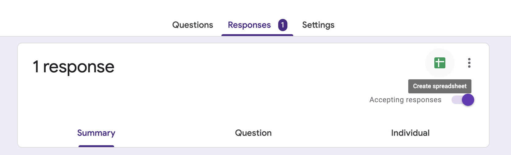 To set up a data merge that uses a Google Form response sheet, you need to switch it on from your Google Form. First, open up your Google Form, then click the 'Responses' tab in the centre of the page. Then click the Google Form icon in the top right corner of the page 'Create Spreadsheet'.